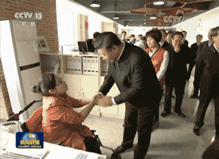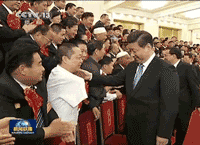习近平同代表们亲切握手,不时寒暄。有一个细节令人感动,当习近平走到一位失去双臂的代表面前时,这位代表躬身向前,努力做出“伸手”的动作,总书记立刻用双手扶住他,并拍了拍他的肩膀,微笑着鼓励说:“小胡林,继续努力!”