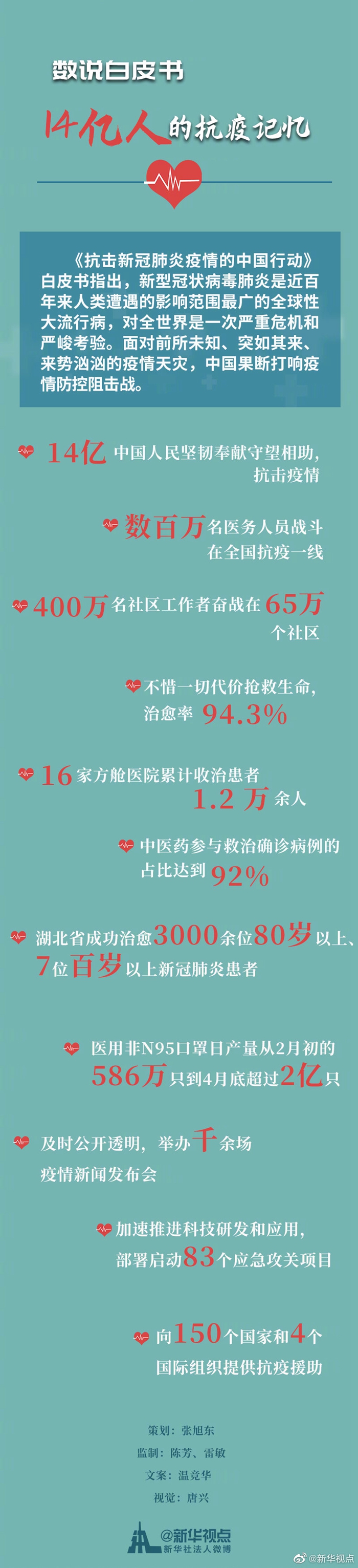 国务院新闻办公室7日发布《抗击新冠肺炎疫情的中国行动》白皮书,旨在记录中国人民抗击疫情的伟大历程,与国际社会分享中国抗疫的经验做法,阐明全球抗疫的中国理念、中国主张。白皮书中的一个个数字,凝结着14亿国人共同的抗疫记忆。