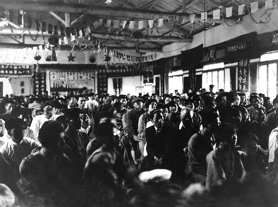 会场主席台上,从上至下悬挂着马克思、列宁、孙中山的照片,左右两侧分别悬挂中国共产党、国民党党旗及标语,标语上写着“资产阶级叛逆后一切革命势力团结于无产阶级周围”等字样。